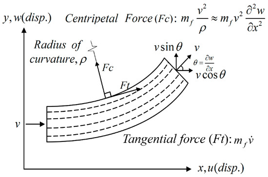 We adopt the nonlinear Euler–Bernoulli beam as the model for the flow tube, assuming that this elastic beam retains its original size and shape even after deformation and remains in the same plane. Figure 4 illustrates a small element on the nonlinear elastic beam for analysis. In this context, the curvature of the beam is defined as , ( )’ represents , and the centripetal force in the fluid flowing through the pipeline is defined as , where mf represents the mass of the fluid. To establish the nonlinear strain of the beam, we employ the relationship between von Kármán’s nonlinear strain () and deformation (u, w) while retaining only the square term change of . This results in obtaining the nonlinear strain of the beam as , where represents the tensile strain and represents the bending strain. In this representation, y denotes the coordinate system of the cross-section of the beam, with u and w representing the directions of the x and y axes, respectively. This study utilizes Hamilton’s Principle to derive the equation of motion for the fluid–solid coupling in this nonlinear system, expressing the kinetic energy (T) as