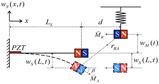There are several references that address the modeling of magnetic interactions using the dipole–dipole method. Fang et al. [33] employed the geometrical dipole–dipole method to model magnetic interactions within the tuned bistable nonlinear energy sink (TBNES). Fan et al. [34] introduced an oscillating substructure that magnetically interacts with a parametrically excited cantilever-based piezoelectric energy harvester, promoting easier snap-through transitions, broadening the operational frequency range, and enhancing energy harvesting efficiency. Mei [35] developed a magnetic-linkage nonlinear piezoelectric energy harvester (PEH) employing one vertical and two horizontal piezoelectric beams coupled by magnetic forces to create time-varying potential wells. Fan et al. [36] uniquely used a directly excited element as an external oscillation source to trigger large-amplitude oscillations in a parametrically excited element through magnetic coupling effects.