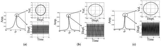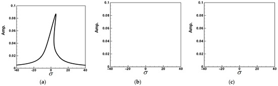 Equation (62) is combined with the real and imaginary parts of the second and third modes to solve for the frequency response of the first mode. The same methodology can be applied to explore scenarios where external forces excite the second and third modes, although a detailed discussion is omitted here. The IMSL’s nonlinear equation solver NEQNF subroutine and Levenberg–Marquardt’s algorithm are employed to solve the simultaneous equations of solvability conditions. Subsequently, the dimensionless amplitudes A1, A2, A3, and the response diagram of the system’s tuning frequency are plotted. This enables the generation of fixed-points plots illustrating the impact of external forces on each mode of the system, including the excitation of the first mode (depicted in Figure 6a–c). It is noted that the responses of the second and third modes are zero when the first mode is excited. Although the excitation responses of the second and third modes are not shown due to layout constraints, a summary is provided in Table 1. These plots facilitate the observation of the frequency response of this nonlinear system.