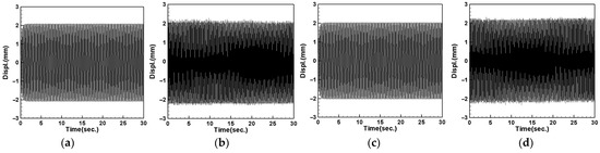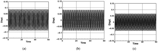 Similarly, multiplying Equation (56) by , we can obtain the real part and imaginary part of the second mode. By multiplying Equation (57) by , we can obtain the real part and imaginary part of the third mode. We consider the case that the first mode was excited and let , and then Equations (58) and (59) can be rewritten as the real part of the first mode: