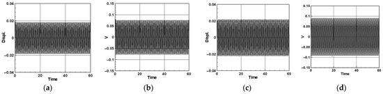 Here, represents the displacement of the vibration absorber positioned in the fluid pipeline LM, and the index n signifies each mode, where n takes values of 1, 2, 3, and so forth. Multiplying Equation (63) by for orthogonalization and disregarding higher-order terms and , the equation of the nonlinear fluid–structure coupling system (comprising the flow tube and damper) can be simplified to