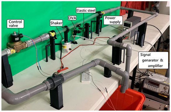 - Conducting a simple experiment to verify the accuracy and feasibility of the theoretical model of this fluid–structure coupled DVA magnetic excitation energy harvesting system. The experiment involves fixing both ends of a flow tube at the water inlet and outlet, pressurizing the water flow with a variable-frequency pump at the inlet, and connecting the outlet to a storage tank via a conduit. The flow pipe is supported by a 3D-printed model. The experiment uses imc© to measure the damping effect and output voltage of the energy conversion for different DVA magnet masses and positions in the flow tube. The experimental and theoretical system output voltages for different DVA masses, positions, and spring constants are compared to verify the proposed model’s feasibility.