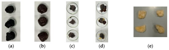Figure 1 and Figure 2 show the samples before (Figure 1a–e) and after (Figure 2a–e) the dehydration procedure conducted using a temperature of 100 °C.