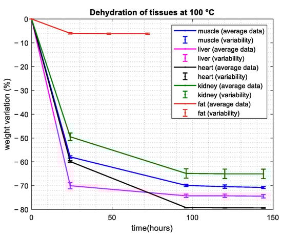 Depending on the tissue type, a different amount of time was needed in order to reach the end of the dehydration, i.e., the total loss of water. Figure 3 shows the percentage variation in the weight of the considered tissues with time. The average weight values and the standard deviation, computed on all samples for each tissue, are shown with dots and vertical lines, respectively.