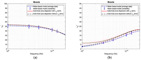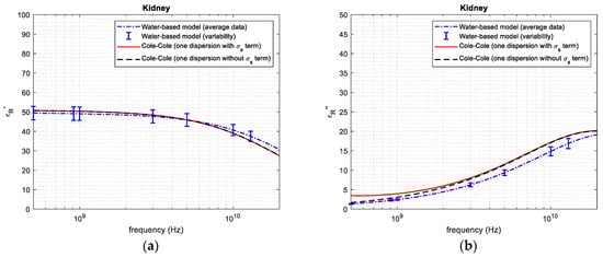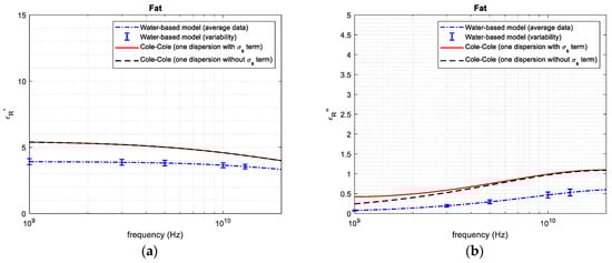 Figure 4, Figure 5, Figure 6, Figure 7 and Figure 8 report the (a) real and the (b) imaginary part of the permittivity of the five tissues in the frequency range of 1–20 GHz. The dashed–dotted blue curves represent the reconstruction obtained with the water-based model (Equations (4)–(6)) from the water content, derived through the dehydration procedure. The uncertainty of the data is represented with vertical bars. The continuous red curves and the dashed black ones represent the reference from [], adopting the 1-pole Cole–Cole model (Equations (1)–(3)) with and without the term being dependent on the static conductivity, respectively.