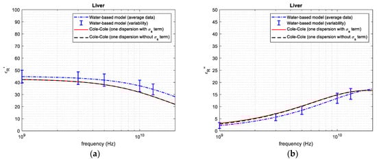 Table 3 shows a comparison between the average results obtained with the water-based model and the Cole–Cole model [] without the static conductivity term for the five tissues at five frequencies in the considered range (1 GHz, 3 GHz, 5 GHz, 10 GHz, 20 GHz). The values of the real and the imaginary parts of permittivity are reported, as well as the percentage difference.