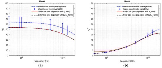 Based on the water content, it was possible to apply the water-based model to calculate the permittivity of the different tissues (Figure 4, Figure 5, Figure 6, Figure 7 and Figure 8). From the figures, it is possible to note that—as derived from Equations (2) and (3)—the presence of the term that is dependent on the static conductivity only influences the imaginary part of permittivity. The behavior of the Cole–Cole model with (continuous red curve) and without (dashed black curve) the σs term is in fact the same for the real part of permittivity, while it shows some differences for the imaginary part, especially at frequencies lower than 2–3 GHz. It is also worth noticing that the presence of static conductivity influences the imaginary part of the permittivity of muscle, heart and fat, while its influence is negligible for liver and kidney. Since the water-based model does not consider the term that is dependent on the static conductivity, the imaginary part of permittivity obtained through the model follows the Cole–Cole reference without the σs term best. For the high-water-content tissues (Figure 4, Figure 5, Figure 6 and Figure 7), the results obtained with the water-based model, considering the associated variabilities, are in good agreement with the Cole–Cole models that were taken as references. For the low-water-content tissue, i.e., fat, in contrast, the water-based model gives a real and an imaginary part that are lower than those obtained from the reference. This can be explained, since fat is a heterogeneous tissue in which some blood infiltration could be present, as is also evidenced by the great variability in water content found in the literature (Table 1). Indeed, the average water content obtained for fat in this work corresponds to the minimum value of the range of values reported in the literature for this quantity (Table 1). In this respect, it is worth recalling that the literature data refer to different samples than those used in this work. Additionally, the reference dielectric properties are obtained from a work [] that is different to that used to compare the water content of the tissue [,], and no information is given in [] about the water content of the measured samples. Consequently, some differences between the obtained results and the reference are expected.
