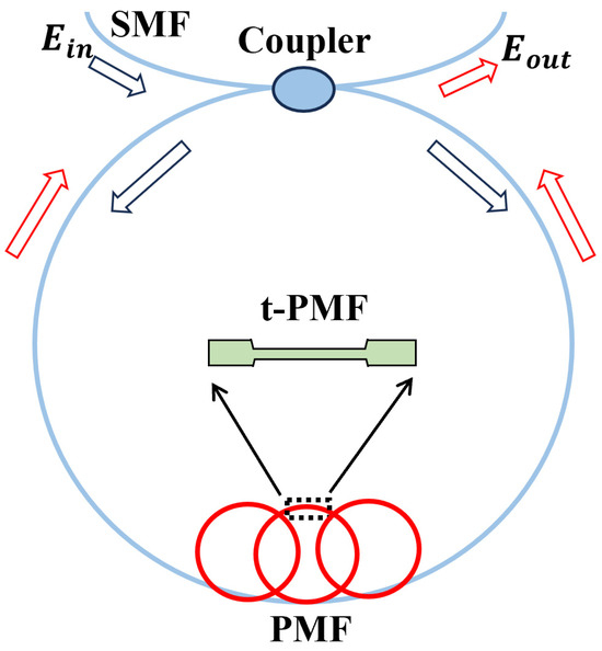 Figure 1 shows the schematic diagram of an SI composed of a tapered PMF. The laser source passes through a 3 dB coupler and is then evenly divided into two beams. The beams propagate simultaneously in the loop, one clockwise and the other counterclockwise. Upon their return to the 3 dB coupler, the beams interfere with each other due to the difference in optical path. Additionally, the high birefringence of PMF introduces a notable phase shift during transmission, which can be mathematically expressed as [41]: