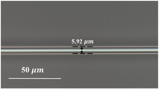Utilizing tapered fiber technology, the evanescent field of the fiber core is brought into full contact with the external refractive index (RI), enabling accurate salinity measurement, and the microstructure of TPMF is shown in Figure 2, with a width of 5.92 μm. At the tapered region, the input light intensity splits, with a fraction coupling to the surrounding environment and the remainder remaining within the fiber. Upon convergence of these two light fractions in the conical region, a phase difference arises due to the discrepancy between the RI of the environment and the RI of the fast and slow axes of the PMF, denoted as . This phase difference can be mathematically described as [41]: