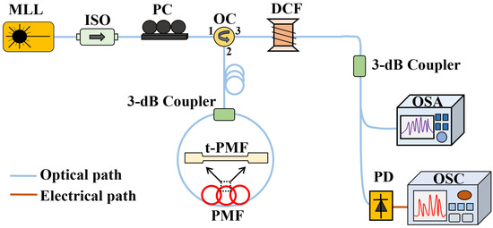 The experimental setup is illustrated in Figure 4. A mode-locked fiber laser (MLL) (EFLA0132, ROI, Guangdong, China) emits femtosecond pulses (44 fs) with a wavelength of 1560 nm and a repetition rate of 50 MHz, which are transmitted to the optical coupler (OC) through an isolator (ISO) and polarization controller (PC). The ISO is employed to safeguard the light source from the harm caused by backscattered light, whereas the PC is utilized to regulate the polarization state of light to guarantee the output light intensity. The pulse light is transmitted via the OC to the 3 dB coupler, where it is simultaneously directed both forward and backward towards the TPMF and it interacts with varying salinity concentrations. Upon recoupling at the coupler, this interference is then transmitted through the OC to the DCF, successfully mapping the spectral domain interference to the time domain. The pulse signal carrying interference information is broadened by DCF and transmitted to the OSA (AQ6370D, YOKOGAWA, Japan) and oscilloscope through a 3 dB coupler for both wavelength- and time-domain demodulation.