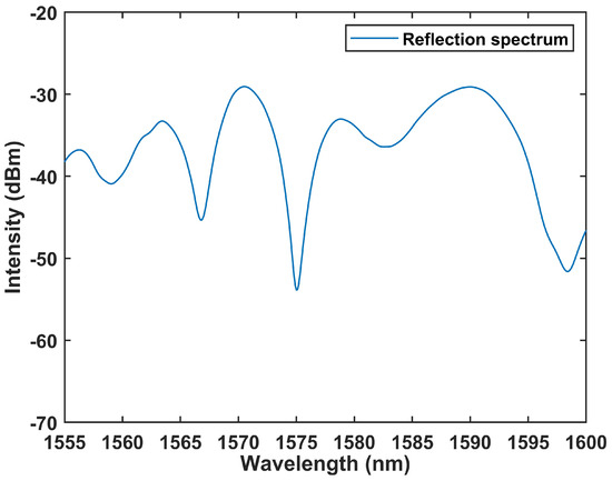 Figure 5 depicts the reflection spectrum of the SI that comprises the TPMF, fabricated using a tapered machine (AFBT-8000LE-H0, Kepler, Shandong, China). The TPMF, heated via hydrogen ignition, has a total length of 25 mm and a waist width of 5.92 μm. The total length of PMF is 30 cm. The specific process for fabricating a tapered optical fiber is as follows: first, the protective coating of the PMF is stripped off, it is cleaned with alcohol, and then it is placed on the tapering machine. Secondly, the vacuum pump is turned on to create a vacuum and use magnets to thoroughly adsorb the optical fiber onto the machine. Thirdly, the operation interface is initialized, the hydrogen ignition device is turned on, and the heating nozzle is ignited to preheat the optical fiber. Fourthly, the upper computer is controlled to start stretching the optical fiber, and the stretching length is fixed at 25 mm to obtain the required tapered optical fiber. Additionally, Figure 5 highlights the superior interference effect, achieving a signal-to-noise ratio (SNR) exceeding 20 dB across the spectrum.