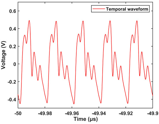 Figure 6 exhibits the time waveform resulting from the mapping of wavelength data from the spectral domain to the time domain. The results indicate notable interference effects in the time domain with some interference information absent. The situation likely stems from the limited dispersion coefficient of the DCF, which fails to fully capture the spectral information. To address this, substitution of the DCF with a higher-dispersion-coefficient fiber is able to solve the problem. Despite this limitation, the interference spectrum in the time domain remains sensitive to salinity variations, as evidenced by subsequent experimental findings.