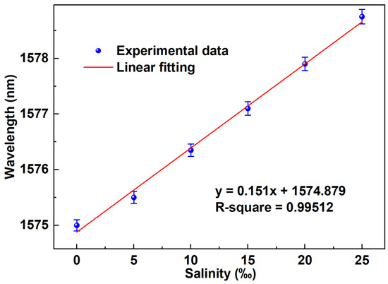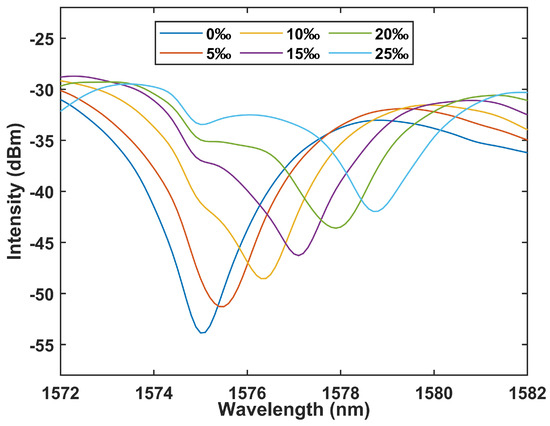 Figure 7 depicts the variation in the interference spectrum shift as the salinity concentration escalates from 0‰ to 25‰, exhibiting a redshift towards longer wavelengths at a 5‰ incremental increase in concentration. This alignment concurs with the theoretical underpinnings outlined in Equation (7).