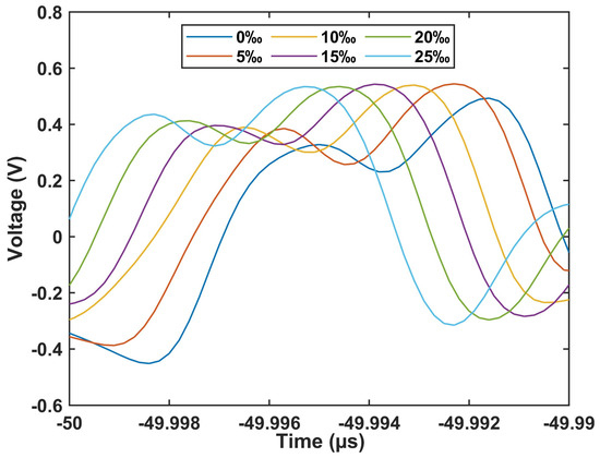 Figure 9 illustrates the interference waveform in the time domain, revealing that as salinity concentration rises, the waveform undergoes a blue shift towards shorter wavelengths, contrary to the trend observed in Figure 7. This phenomenon arises due to the negative dispersion coefficient of DCF, aligning with the theoretical predictions outlined in Equation (7).