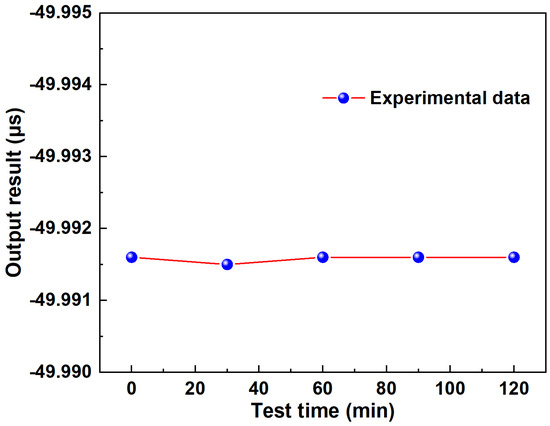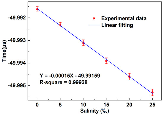 Figure 10 presents the outcome of the linear fitting equation applied to the time waveform, exhibiting a noteworthy sensitivity of −0.15 ns/‰ in the time domain, indicating its superior performance. The coefficient of determination stands at an impressive 0.99928, reflecting an almost perfect linear relationship. This remarkable linearity is highly beneficial for the sensor, facilitating intuitive assessments of salinity concentration. Figure 11 shows the stability test results of the sensor, and the experimental results show that when the salinity concentration is 0‰, the fluctuation in the time domain is less than one thousandth of a microsecond. Furthermore, leveraging the ultra-high repetition rate of the femtosecond pulse, this system achieves an interrogation demodulation speed of 50 MHz, surpassing an ordinary OSA by hundreds of times in speed. The experiment is repeated five times and the maximum error in time domain is calculated to be 0.00015, and the maximum error in wavelength domain is calculated to be 0.13.