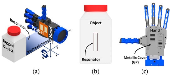 This study presents a new wireless radio-frequency-sensing system that operates within a pre-touch sensing range for grasping plastic objects. Its objective is to orient the robot hand with the object in various directions by utilizing probe-resonator interactions. Consequently, irrespective of the object’s color, size, shape, or surface properties, the grasping operation becomes feasible by positioning and orienting the resonator appropriately on the object. This sensing system excels in providing close-range sensing capabilities, overcoming issues that optical sensors may encounter such as blind spots, reflections, or low-light conditions. Unlike capacitive sensors, the sensing system does not face limitations in detecting plastic or non-grounded objects. Another advantage is its multifunctionality, as it can detect linear motion, distance, and the angle between the hand and the object. The cost efficiency and ease of production are notable benefits of this sensing system. It is designed to be economically viable, making it affordable to produce and deploy. Preliminary investigations have been conducted for a sensing system for robotic grasping and localization in [,,,], whereas angular position monitoring based on passive resonators has been exploited in a far-field reading scenario in []. In [], two different kinds of CWP antennas were introduced as probes to find the best design for the angular alignment of the hand with the object presented. In this work, the approach has been further developed to detect the object even in near-field scenarios. The robotic hand is then aligned in the desired location and distance from the object for grasping.