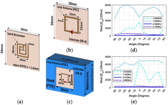 In order to select the optimal topology for the probe and resonator, three different solutions are investigated. The initial candidate for the probe during the simulations was chosen based on a distance sensor that prominently features a spiral resonator (SR) label printed on a dielectric substrate (Figure 2a) and remotely interrogated via a small-loop antenna (Figure 2b) as a reader presented in []. By observing the change in the real part of the input impedance in four different peak frequencies of the loop and spiral resonator (Figure 2d), it can be observed that there is a potential ambiguity in estimating rotation angles of 0 or ±90 degrees since their values are close due to the intrinsic symmetry of the probe. For example, even though at the frequency of 1.43 GHz there is significant variation in the real part of impedance across different angles, the values are very close together at angles of 0 or ±90 degrees. Additionally, when the probe is integrated into the robotic hand (Figure 2c), its behavior becomes unstable, rendering the impedance ineffective for angular alignment goals (Figure 2e).