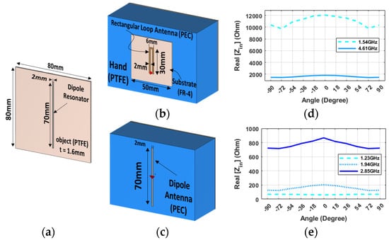 Dipole configuration: 3D illustration for (a) the dipole resonator, (b) the narrow-loop antenna on hand and near GP, and (c) the dipole antenna on hand and near GP. The real part of Impedance (CST) at 8 mm versus different angles and frequencies for the dipole resonator in coupling with (d) the narrow-loop antenna and (e) the dipole antenna.