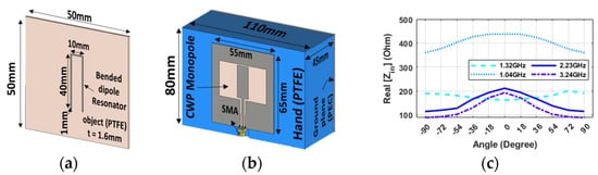 Hairpin resonator configuration: 3D illustration for (a) the U-shaped bent resonator, (b) CPW monopole antenna on hand and near GP, and (c) the real part of Impedance (CST) at 8 mm vs. different angles and frequencies for the U-shaped resonator in coupling with CPW monopole.
