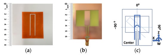 To achieve successful grasping of the object, it is essential to accurately determine its angular alignment with the hand. This necessitates the design of the appropriate probe and resonator for the task. Initially, a series of simulation studies were conducted using CST Microwave Studio for this purpose. The hand has been represented by a PTFE substrate (εr = 2.1) with a thickness of 45 mm. The hand’s backside is grounded to replicate the metallic back of the robotic hand depicted in Figure 1c. The object is a rectangular PTFE medicine box measuring 50 mm × 50 mm or 80 mm × 80 mm with a thickness of 1.6 mm. The substrate used for the antennas was FR-4 with (εr = 3.2).