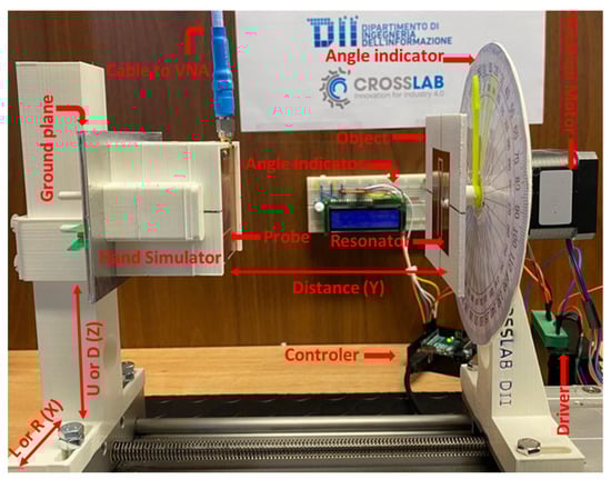 Figure 6 shows the experimental setup, including the moving axis and the placement of the probe and resonator. The probe was situated on a PLA component mimicking the robotic hand (including the metal backhand) and connected to the ANRITSU SHOCKLINE MS46524B Vector Network Analyzer (VNA). To assess the variation of the scattering parameters (S11) as a function of the probe and resonator alignment, a 3D-printed platform was created. This platform closely resembled the robot hand and a plastic object in terms of dimensions and material properties. All the 3D-printed components on the platform were made of PLA (εr = 3.55). The object, bearing the resonator, was linked to a stepper motor, which was controlled using an Arduino Uno R3 to automatically capture measurements for various angular alignments. In order to evaluate the performance of the sensor at various distances between the hand and the object in the Y-direction, both were placed on a linear rail. Three-dimensional-printed components were carefully designed to allow for adjustments in planar alignment along the Z- (up and down) and X- (left and right) directions. Additionally, two analog and digital displays were incorporated to precisely monitor and display the angle (around the W-axis) between the hand and the object.