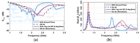 The probe’s frequency response was analyzed by conducting an initial assessment in three distinct scenarios. These scenarios included the probe alone on air, the probe placed on the hand with a ground plane (metallic backhand), and on the hand with a ground plane along with the tag perfectly aligned at 8 mm. It is apparent in Figure 7a that the presence of the ground plane causes some minor alterations within the primary resonance bandwidth, which spanned from 2.0 GHz to 2.5 GHz, and a more pronounced change below 3.5 GHz (dotted blue vs. dashed red curves). Conversely, coupling with the tag (solid blue curve) resulted in massive modifications that are obvious both in S11 and impedance. Looking at S11, noticeable additional peaks between 1.5 GHz and 2.5 GHz and around 3.0 GHz have appeared. This frequency range warrants careful exploration to identify the most significant frequency for implementation in the studied grasping system.