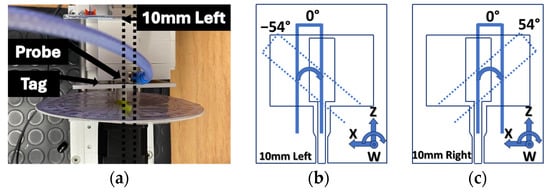 Alignment along X-direction: (a) setup configuration for orientation control, (b) resonator positioned 10 mm to the left, (c) resonator positioned 10 mm to the right.