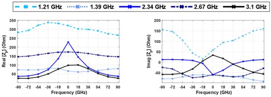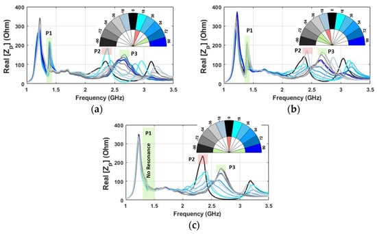 The variations in the real part of input impedance at different angles, considering the placement of the resonator in three positions (center, left, and right, relative to the probe), are presented in Figure 9. It can be noticed that when the tagged object is positioned on the left or right side, an additional peak appears at a frequency of around 1.39 GHz due to the unsymmetric couplings, which are shown with P1. However, no significant peak is observed at this frequency when the resonator is aligned at the center. Moreover, the highest value of impedance belongs to angles of 54 and 72 degrees (after 0 degrees) when the resonator is placed on the left side. When the resonator is placed on the right side, the highest value of impedance is observed at approximately −54 and −72 degrees (before 0 degrees) because of the mirror effect. This behavior is clearly demonstrated at two distinct frequencies. The first frequency, labeled P1, is approximately 1.4 GHz, while the second frequency, labeled P2, is around 2.7 GHz. These frequencies have been highlighted in a vibrant green color to draw attention to them, allowing for easy identification and analysis. Another noteworthy finding is the presence of a resonance in the frequency range of 2.3 GHz–2.4 GHz (P2 and vibrant red), which is the main resonance that belongs to the resonator (Figure 7b) [] and demonstrates distinct behavior depending on the position of the resonator. When the resonator is on the left, the maximum value of impedance is linked to an angle of 18 degrees (after 0), while it corresponds to −18 degrees (before 0) when the resonator is on the right side. Interestingly, this behavior further highlights that the peak at this frequency band is associated with 0 degrees when the resonator is at the center position. To facilitate comprehension of the observed behaviors, a 180-degree legend has been created for Figure 9. The legend is marked with colors that correspond to the frequency points, and the angles with the highest impedance at these frequencies are highlighted with the same color as the mentioned point. This design helps to visually identify the patterns of impedance at different frequencies and angles, providing a clearer understanding of the data. Furthermore, when the resonator is placed on either side, it induces an additional peak within the 2.8 GHz-to-3.2 GHz frequency range, while if it is positioned centrally, these peak points coalesce around comparable frequencies.