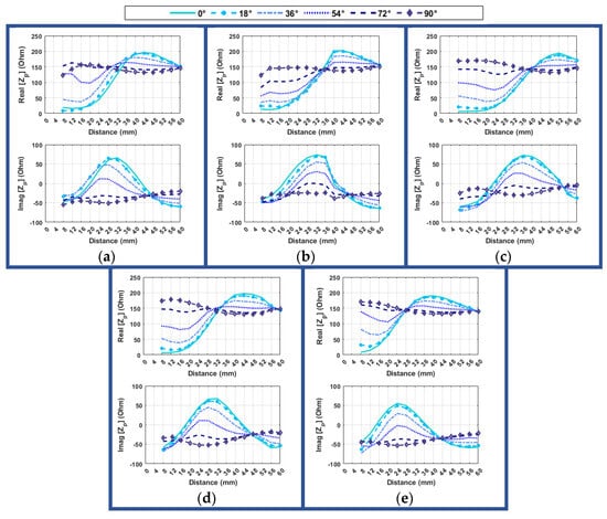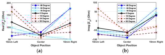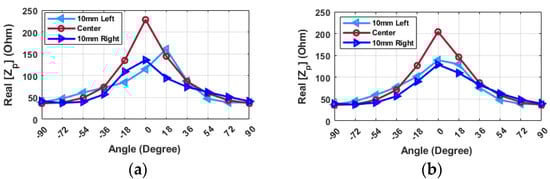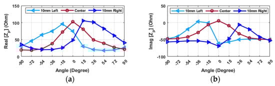 Figure 10 shows that the minimum impedance value is achieved at the center position, with a fixed frequency of 1.39 GHz in both the real and imaginary parts for most angles because there is no significant peak in this position. As the hand moves to the left or right, the impedance value increases. Moreover, the mirror relationship between positive and negative angles indicates similar impedance values for corresponding angles in the opposite side. Indeed, it can be observed that the impedance values for positive angles (indicated by red color tones) are higher when the hand is on the left side, while for negative angles (shown in blue), the impedance values are higher when the hand is on the right side. This asymmetry indicates that the position of the hand relative to the resonator has an impact on the impedance characteristics. At an angle of zero degrees, the real part of the impedance is undoubtedly almost identical on both the left and right sides, while it is significantly lower when the object is positioned at the center.