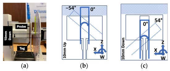 In a different scenario, the experiment aimed to determine the central position by vertically moving the hand along the Z-axis, as depicted in Figure 13. In this scenario, the performance of the sensor was assessed concerning angular variations and changes in distance. It is important to mention that when the resonator was positioned 10D, it was not directly in front of the upper side of the probe’s ground plane (hatched section in Figure 13c). This discrepancy could result in a decrease in the response of the resonator to the probe. However, when positioning it in 10U, the situation closely resembled the placement at the center (Figure 5c).