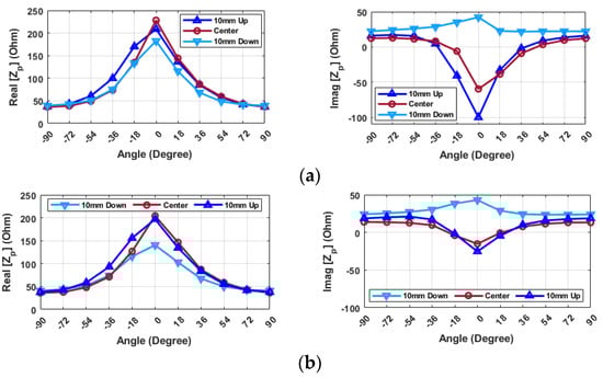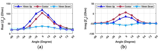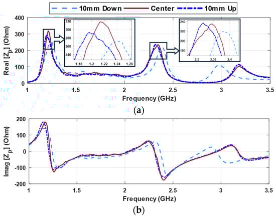 Input impedance of the probe (Zp) for various alignments of probe and resonator in the X-direction (f = 2.34 GHz): (a) distance = 8 mm (b) distance = 12 mm.