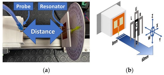 During the experiment, the separation distance between the hand and the object was systematically adjusted, ranging from 8 mm to 60 mm with 4 mm increments. Additionally, measurements of the probe reflection coefficient (i.e., S11 scattering parameter) were collected by scanning over a 360-degree rotation with intervals of 18 degrees. These measurements were conducted under various scenarios, including situations where the resonator was positioned 10L, 10R, 10D, or 10U on the object, in addition to the central tag placement. In all experiments, the frequency range was configured to span from 0.5 GHz to 4.0 GHz. So as a result, data were collected for all angles at all distances and points.