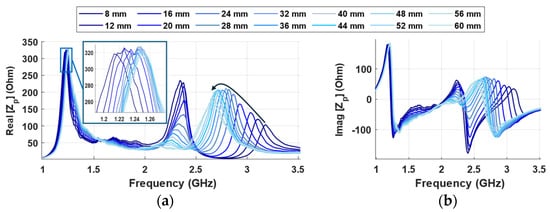 Input impedance of the probe (Zp), (a) real, (b) imaginary while adjusting the distance between the probe and resonator with angular alignment in 0 degrees.