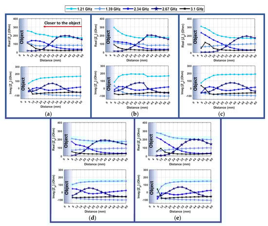 Overall, the trend of the changes in values for different frequencies is similar for different resonator-probe positions, which makes it possible to find the proper distance in all the situations. At a frequency of 1.21 GHz, both the real and imaginary parts exhibit a trend that can assist in determining the correct distance in all scenarios. In most cases, the real impedance values start around 200 ohms at 60 mm and increase up to approximately 300 ohms when reaching 8 mm. This variation is more pronounced for the case where the resonator is placed in 10D. On the other hand, the imaginary part demonstrates a decreasing trend as the hand gets closer to the object, and the variation in the value is smoother in most cases.