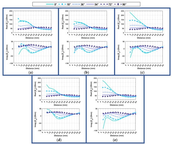 It is evident that more pronounced differences occur at various distances as the angle approaches zero degrees. Consequently, it becomes easier to distinguish between different distances when the angle is closer to zero degrees. Conversely, when the angle is between 90–72 degrees, the variation is negligible, thus making a precise estimate challenging. Therefore, if the impedance exhibits minimal variation, especially in its imaginary segment, it indicates that the angle of approach may not be optimal. However, for a value lower than 54 degrees, the distinctions become more discernible, and it generally becomes easier to accurately determine the proper distance. It appears that these conditions remain consistent regardless of the hand’s position in relation to the object. In general, for angles lower than 36 degrees, the real part of impedance typically exhibits an increasing trend, whereas the imaginary part initially decreases until 32 mm and then follows an increasing slope up to 16 mm, after which it begins to decrease again until 8 mm. However, for distances smaller than 10 mm, there is a distinctive pattern where the imaginary part decreases to 28 mm and then starts increasing again until 8 mm. These variations in impedance behaviors provide valuable insights for distance estimation and alignment considerations in different scenarios. The angle of alignment between the hand and the object significantly affects the system’s performance in estimating distance, and the patterns observed tend to be similar across different hand positions relative to the object. This highlights the significance of considering the angle of alignment when using the system for distance estimation.