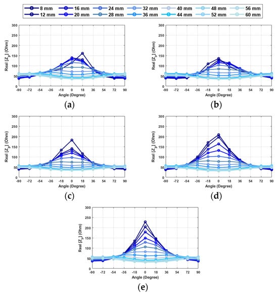 Figure 23 illustrates the actual part of the input impedance under various conditions. In many instances, when distances surpass 32 mm, the alterations in impedance values remain relatively consistent, allowing for alignment, albeit with potentially reduced precision. However, beyond this 32 mm threshold, there is a notable rise in the sensitivity of impedance changes, especially concerning distance. When the distance decreases, the differences between 0 degrees and adjacent angles become more pronounced. This condition is especially favorable when the distance is 8 mm, as it enables angular alignment with exceptional precision. It is also illustrated that angular alignment remains achievable even when the probe and object are not perfectly aligned along the X- or Y-direction. However, the values and differences between them are comparatively smaller in certain scenarios. For instance, when the object is positioned out of the center, the alignment angle can be estimated with an approximate value, and subsequent adjustments can be made after achieving full alignment.