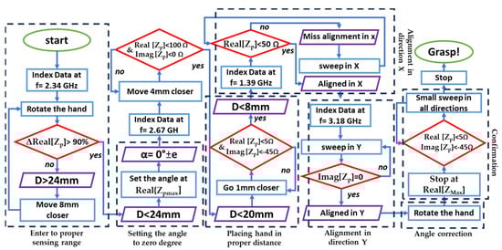 The presented results have allowed us to characterize the features of the proposed probe-tag configuration. The deployment of this sensor system requires a series of careful considerations aimed at defining a structured approach for successful object detection and manipulation in a scenario where the object’s location and orientation are unknown. A series of sequential operations, illustrated in the flowchart of Figure 24, is at the basis of the protocol to be followed for a reliable alignment and grasping operation. The exploitation of the individuated optimal frequencies as peculiar to the probe-sensor interaction is the key point for the overall search and discovery process. The only initial hypothesis for this proximity probe is simply to be within 60 mm from the tag. The search starts by moving the probe (i.e., the robotic hand) and collecting the data (i.e., the value of the probe-input impedance). Since having a good accuracy for the angle is challenging over long distances, the first goal is to bring the hand closer to the object and enter the range for accurate angular alignment (32 mm in this case). Based on the previously analyzed trends, the probe data collected at 2.34 GHz are the most useful for this task (Figure 23).