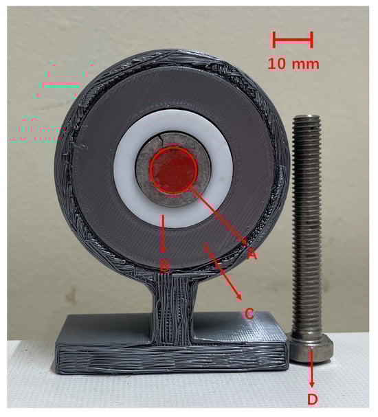 Detailed view of the alpha source setup: (A) active area, (B) plastic ring, (C) 3D-printed polylactide stand, and (D) control surface bolt.