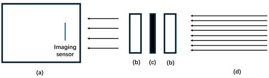The filters were arranged in a sandwich structure, as depicted in Figure 3, to enhance the blocking rate of the system. This configuration incorporates an absorptive filter between two reflective (or interference) filters to minimize multi-reflections and enhance image clarity []. The transmission of this filter arrangement within the signal wavelength band is 67%.