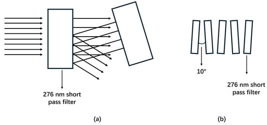 (a) By tilting the filters, light that might otherwise reflect between them is directed off-path. After a few reflections, this stray light is absorbed by the lens tube, thereby reducing the light-bunching effect; (b) Arrangement of the stacked five 276 nm short pass filters for sunlight detection.
