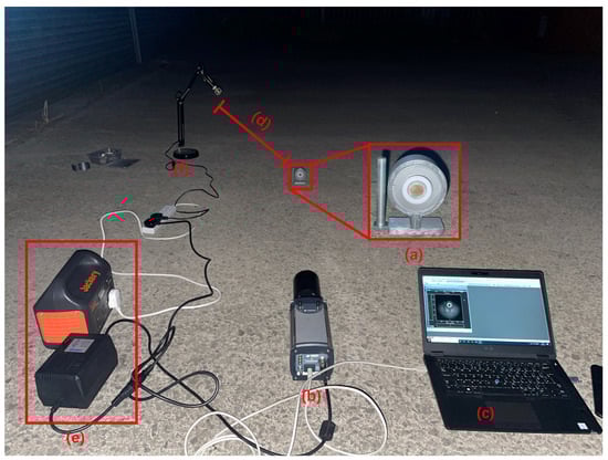 Experimental setup for night-time imaging of alpha RL: (a) alpha source, (b) alpha camera, (c) controlling laptop, (d) distance between light bulb and alpha source, (e) power bank and supply, (f) light lamp simulating ambient light source.