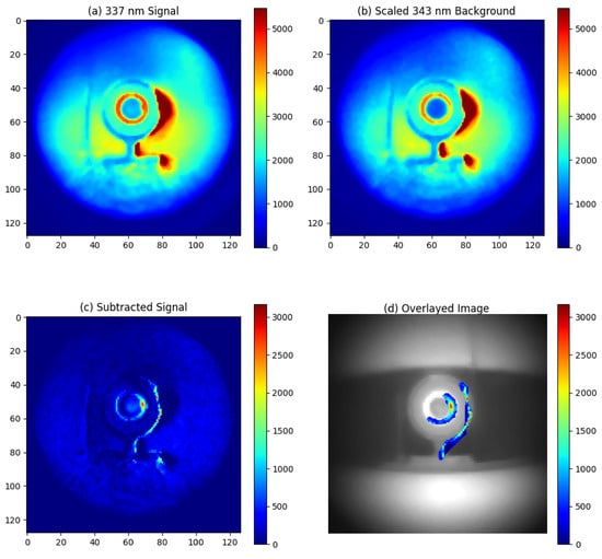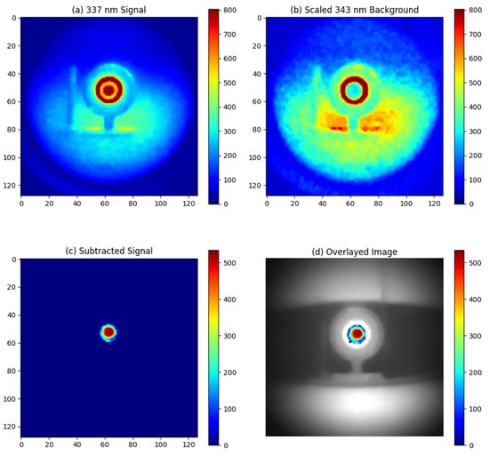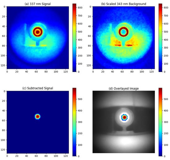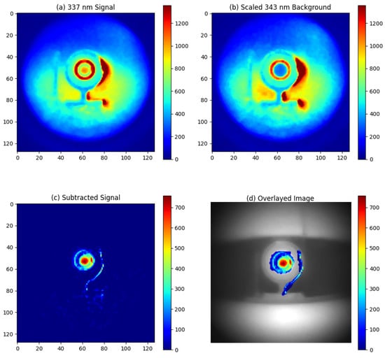 Experimental result for night-time imaging of alpha source at 1 m distance with an LED light source placed 1 m away from the alpha source: (a) Signal image around 337 nm, (b) Background image around 343 nm, (c) Signal obtained by subtracting the 343 nm background from the 337 nm emission, (d) Overlay of the subtracted signal on a visible light image of the alpha source.