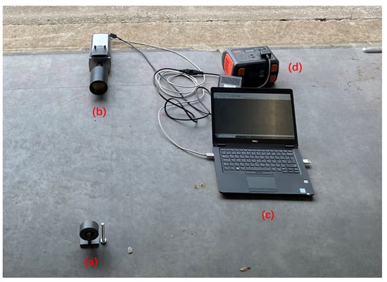 Experimental setup for daytime imaging of the alpha source: (a) Alpha source, (b) Alpha camera, (c) Controlling laptop, (d) Power bank and supply.
