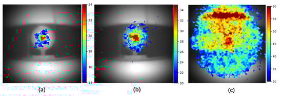 Experimental results for daytime UVC imaging of the alpha source at a 70 cm distance in 10 min. The alpha source signal is represented using a color map and overlaid on a visible light image of the alpha source. (a) Controlled group of detection in a dark room. (b) Under indirect sunlight, the alpha source signal is visible. (c) Under direct sunlight, the ambient background overwhelms the signal, making it undetectable.