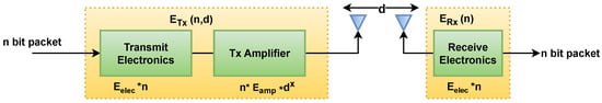 The first-order radio model is considered in this study, as presented by the authors of [44]. The ratio of the energy consumption model is based on the distance between the sender and receiver. Figure 3 shows the energy consumption model, where the energy required to send a message is calculated based on the sender–receiver distance and the total length of the message.