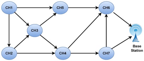 Let us consider the network shown in Figure 4, where graph shows the vertices, with each CH acting as a gateway, and E represents the edges. Table 2 shows nodes within the range of a particular CH and the total number of relay nodes. According to Figure 4, there are seven CHs connected with each other within the communication range. We assign each CH a random number , which maps to a random relay node destination. Some of the CHs are connected to the BS. When CH1 wants to send data to the BS, it can route the data through .