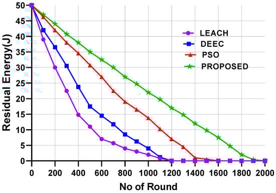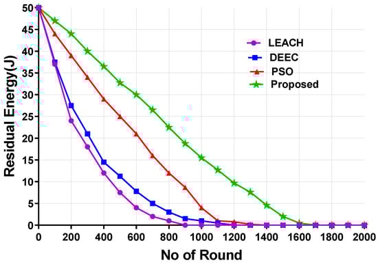 For Scenario 1 (Figure 6), the LEACH and DEEC models showed that all nodes’ residual energy was depleted after 1200 rounds. PSO performed better than the LEACH and DEEC models, with residual energy becoming low around 1450 rounds. However, the proposed model performed much better than the LEACH and DEEC models, with the residual energy lasting until after 1957 rounds.