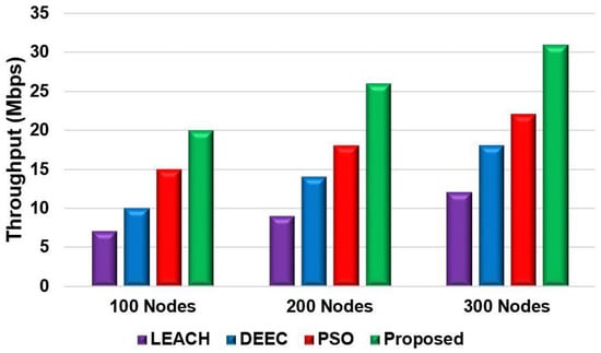 Figure 8 and Figure 9 show the network performance throughput for the proposed model compared with that of the LEACH, DEEC, and PSO models for Scenario 1 and Scenario 2, respectively. The throughput was also measured by changing the number of nodes. In both scenarios, the proposed model’s network throughput was significantly higher than that of the other protocols. The proposed model achieved a throughput increase of 10 to 20% compared to the other models. This can be attributed to the proposed model’s fitness function, which reduces energy consumption during data transmission to achieve a higher network throughput.