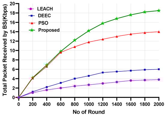 - Throughput: This is another important performance factor for evaluating the protocol. Throughput defines how much information the client receives from the monitoring area that the sensors collect and send. It measures how many packets the BS receives from the sensor nodes.