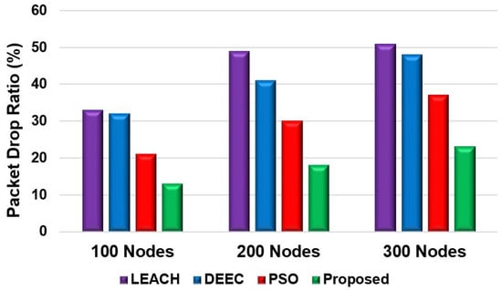 Packet-drop ratio for different numbers of nodes in a WSN.
